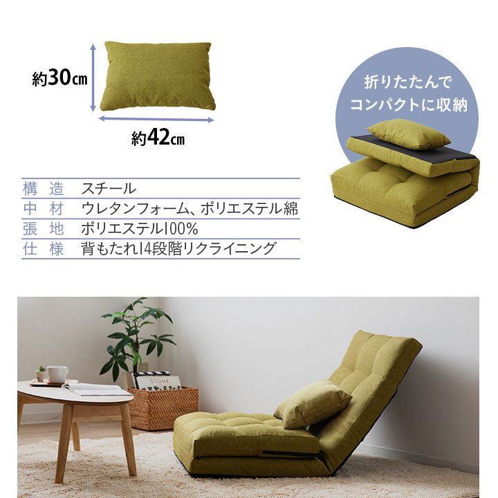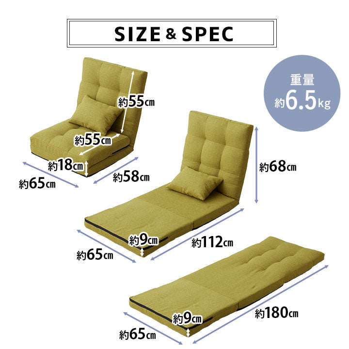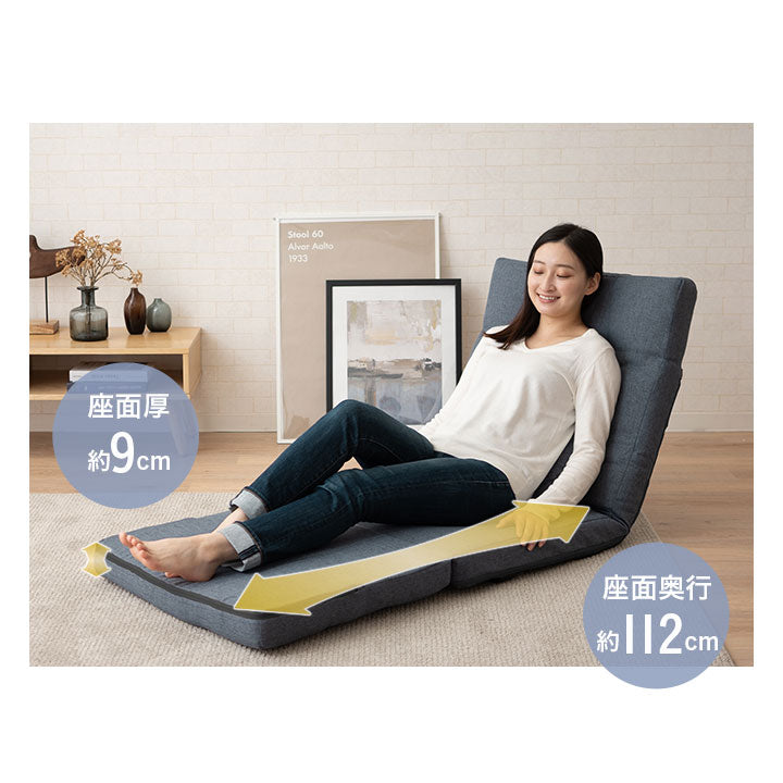 広い座面が特徴で、折りたためば極厚座椅子、フラットにすれば大人が寝られるベッドにも変身します。