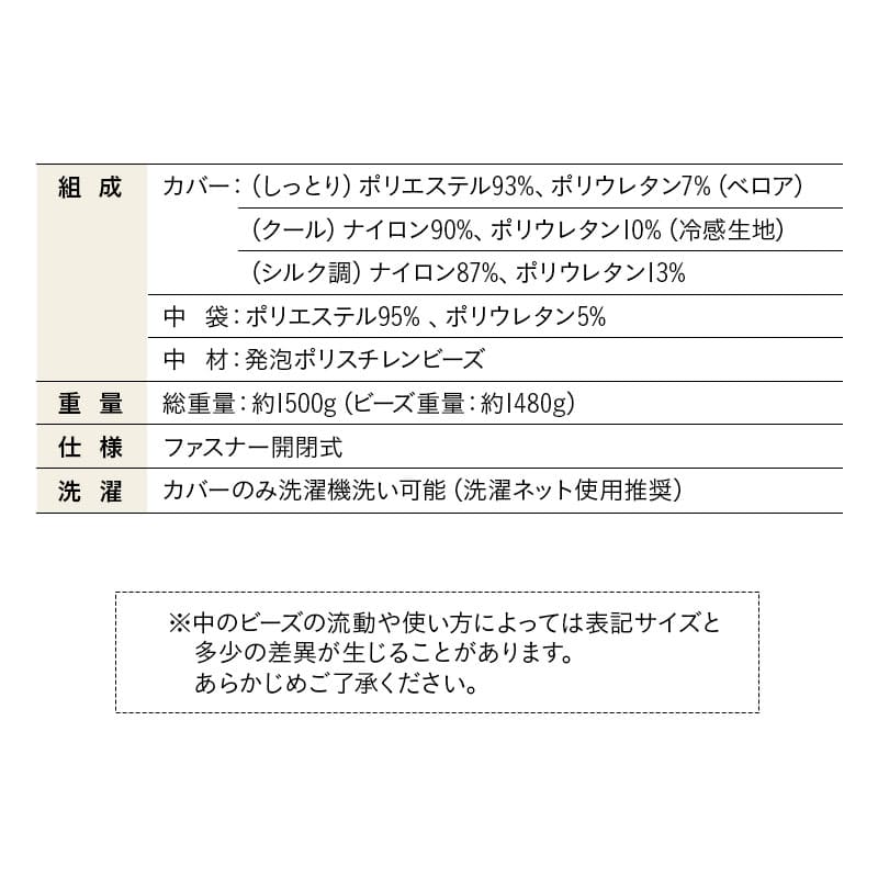 | 組成 | ■カバー しっとり:ポリエステル93%、ポリウレタン7%(ベロア生地) クール:ナイロン90%、ポリウレタン10%(冷感生地) シルク調:ナイロン87%、ポリウレタン13%(サテン) ※付属するカバーは、お選びいただいた1種類のみです。 ■中袋 上層:ポリエステル95%、ポリエウレタン5% 裏/側面:綿100%(ツイル生地) ■中材 発泡ポリスチレンビーズ |
