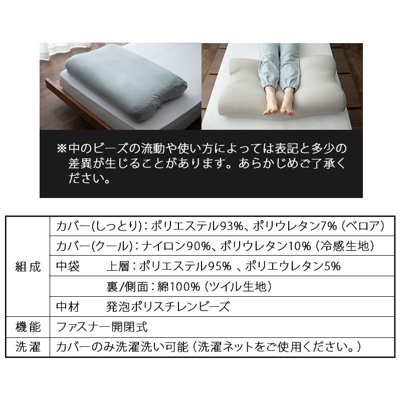組成 | ■カバー しっとり:ポリエステル93%、ポリウレタン7%(ベロア生地) クール:ナイロン90%、ポリウレタン10%(冷感生地) ※付属するカバーは、お選びいただいた1種類のみです。 ■中袋 上層:ポリエステル95%、ポリエウレタン5% 裏/側面:綿100%(ツイル生地) ■中材 発泡ポリスチレンビーズ |