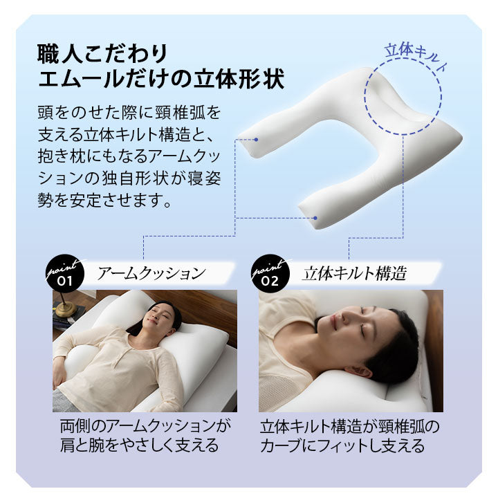 独自の立体構造とアームクッションで首・肩・腕までやさしく支え、浮遊感のある寝心地を実現します。