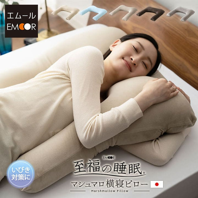 睡眠研究を重ねたEMOORの「マシュマロ横寝ピロー」は、至福の眠りを追求した横向き寝専用枕です。