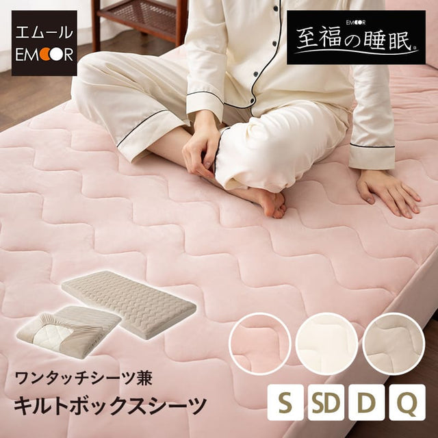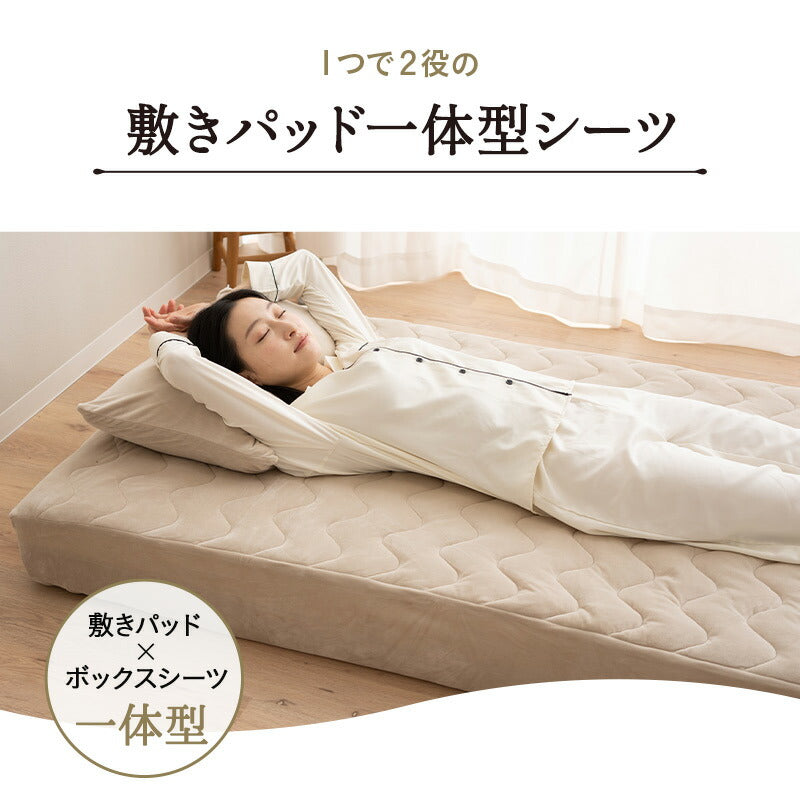 敷きパッドとシーツが一体型となり、敷き布団やマットレスにぴったりフィットするキルトボックスシーツです。