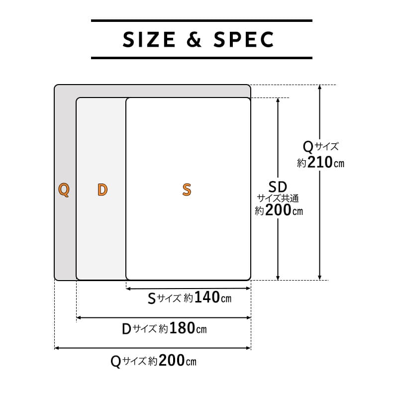 サイズ | シングルサイズ:約140×200cm ダブルサイズ:約180×200cm クイーンサイズ:約200×200cm |