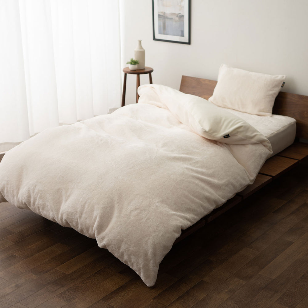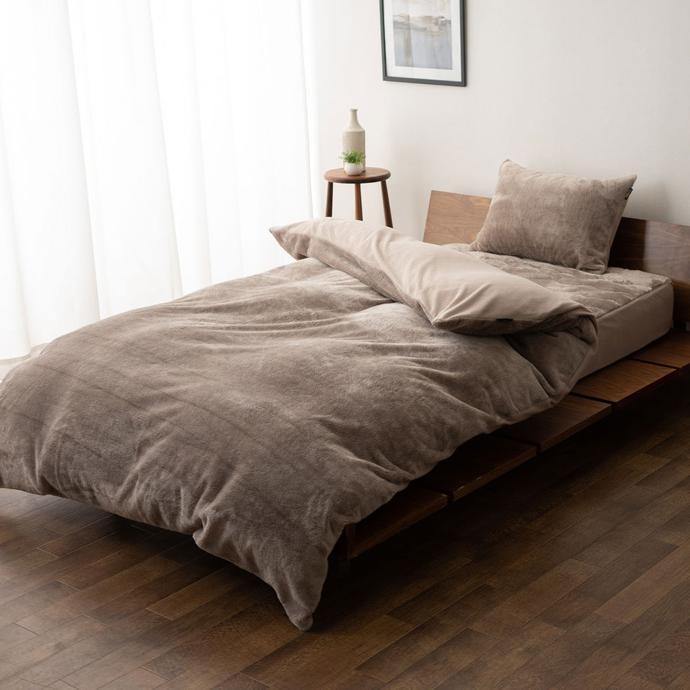 8mmの極細ロングパイル生地は空気をたっぷり含み、ふんわりなめらかな触感と高い保温性を実現しています。