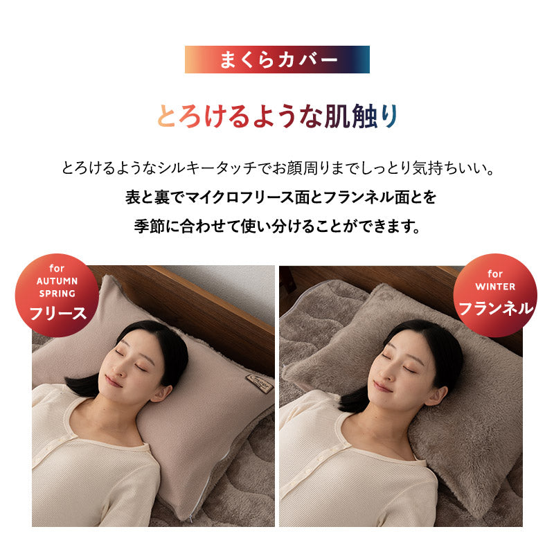 | 枕カバー(2枚組) | ■サイズ 約43×63cm ■組成 表地:ポリエステル100%(280g/m² ロングパイルフランネル8mm) グランド部分:ポリエステル50%、レーヨン50%(エムールヒートプラス使用) 裏面:ポリエステル100%(マイクロフリース) ■仕様 片側全開ファスナー式 |