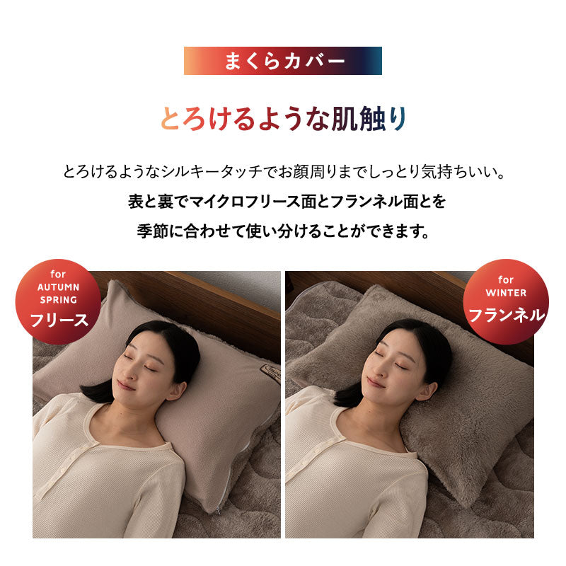 枕カバー(2枚組) | ■サイズ 約63×43cm ■組成 表地:ポリエステル100%(280g/m² ロングパイルフランネル8mm) グランド部分:ポリエステル50%、レーヨン50%(エムールヒートプラス使用) 裏面:ポリエステル100%(マイクロフリース) ■仕様 片側全開ファスナー式 |
