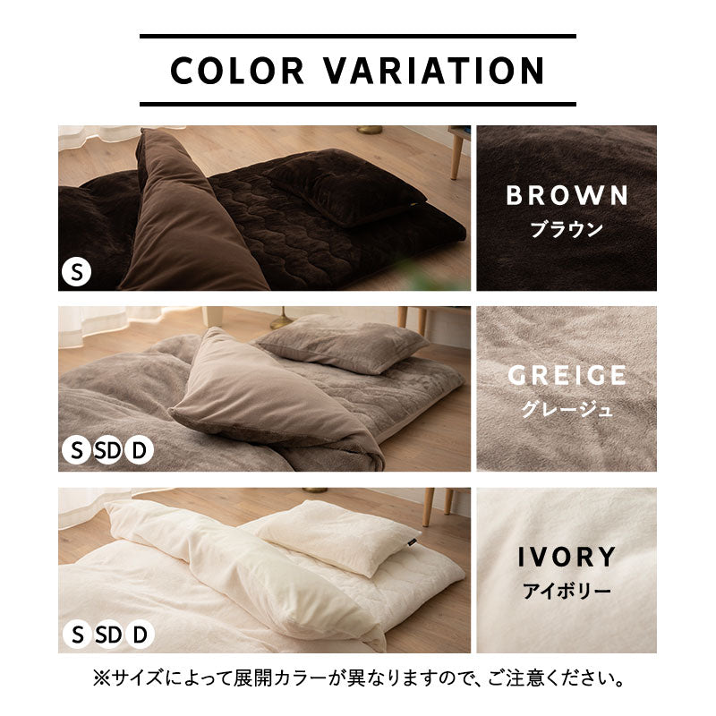 掛け布団カバー | ■サイズ シングルサイズ:約150×210cm セミダブルサイズ:約170×210cm ダブルサイズ:約190×210cm ■組成 表地:ポリエステル100%(280g/m² ロングパイルフランネル8mm) グランド部分:ポリエステル50%、レーヨン50%(エムールヒートプラス使用) 裏面:ポリエステル100%(マイクロフリース) ■仕様 8箇所ヒモ付き 片側全開ファスナー式 |