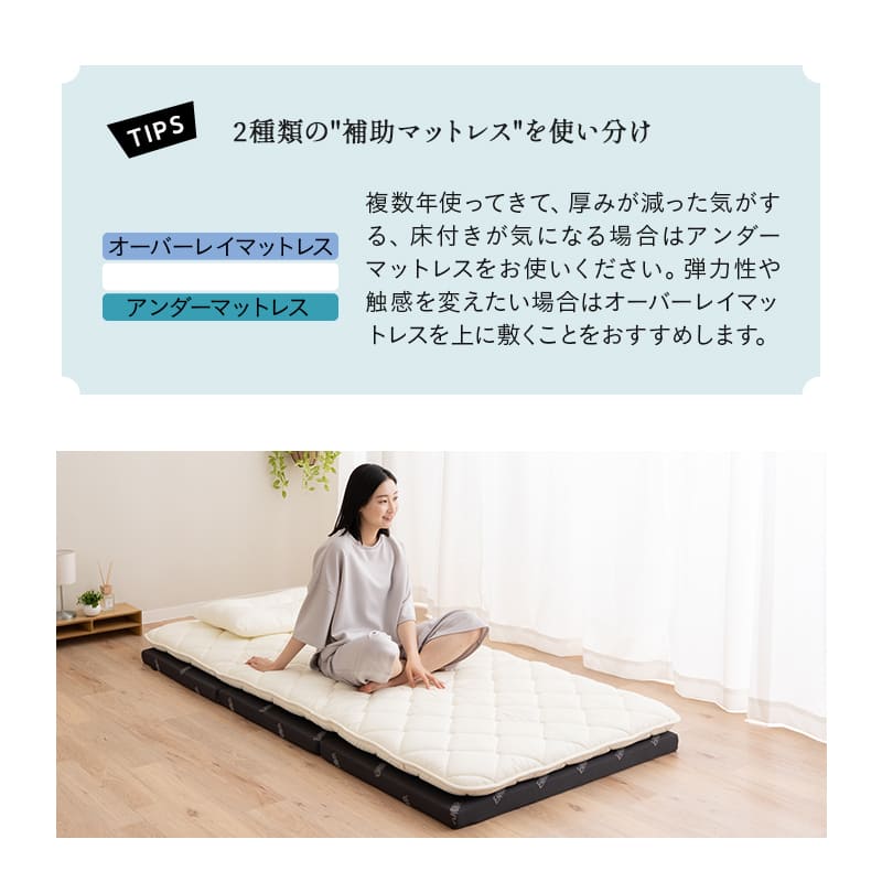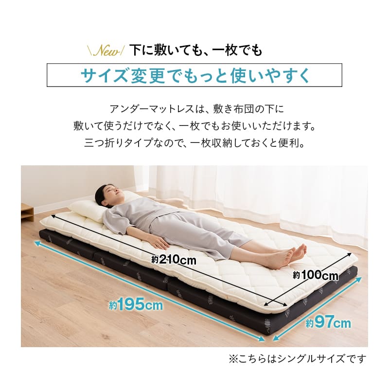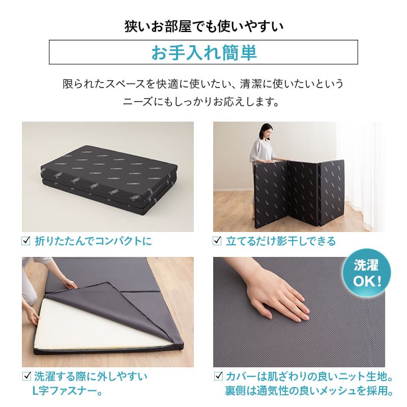 敷き布団の下でも一枚でも使える三つ折りタイプで、収納性と使いやすさを両立しています。