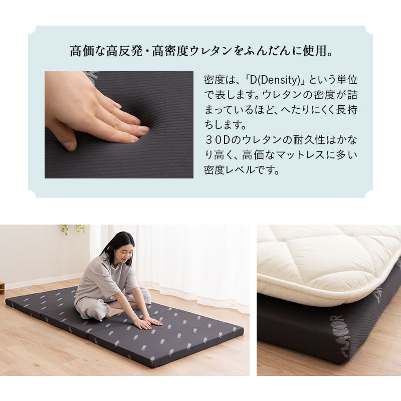 厚み約5cm、密度30Dで耐久性に優れ、へたりにくく長期間快適な寝心地が持続します。