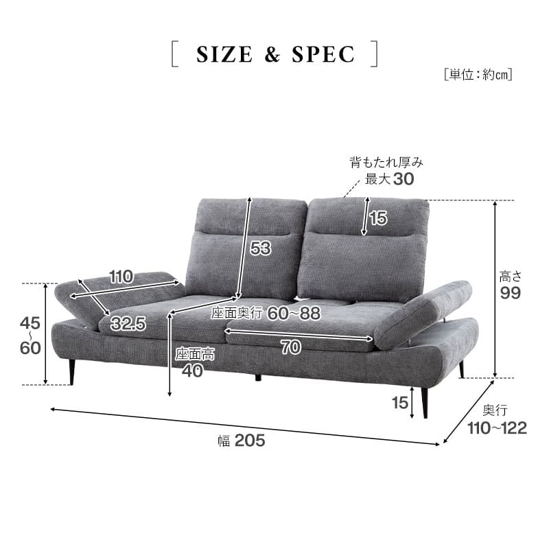 サイズ | 全体:約幅205×奥行110-122×高さ99cm 座面:約幅140×奥行60-88×高さ40cm 背もたれ:約幅140×長さ53cm |