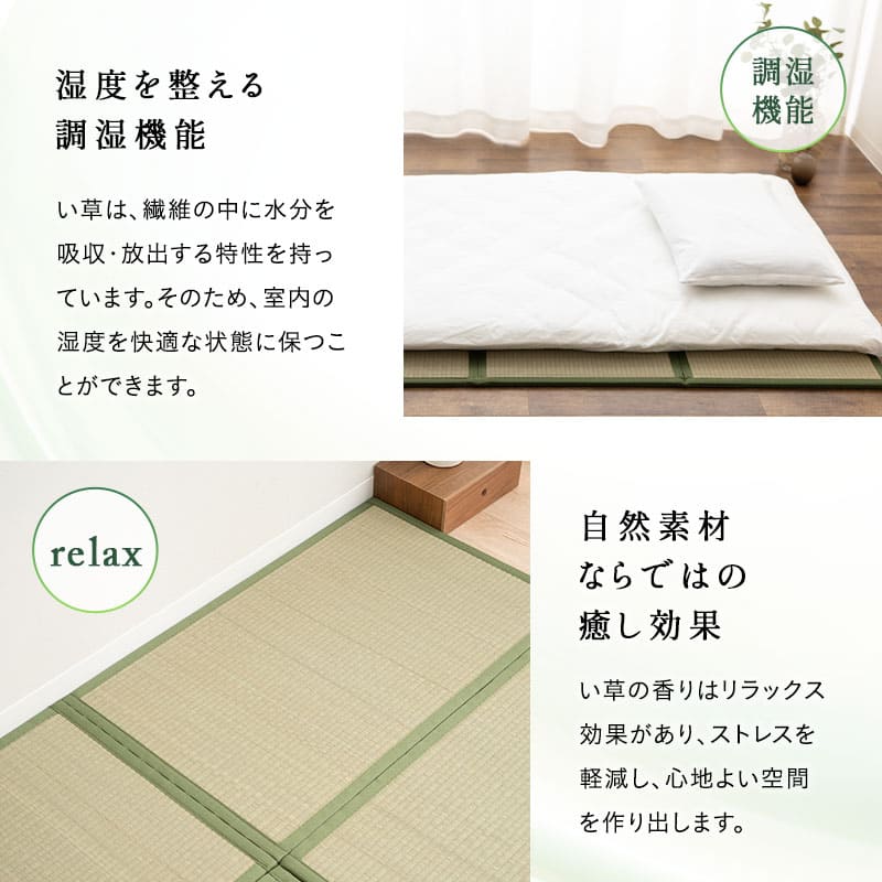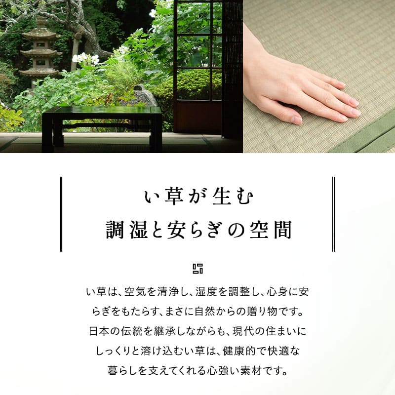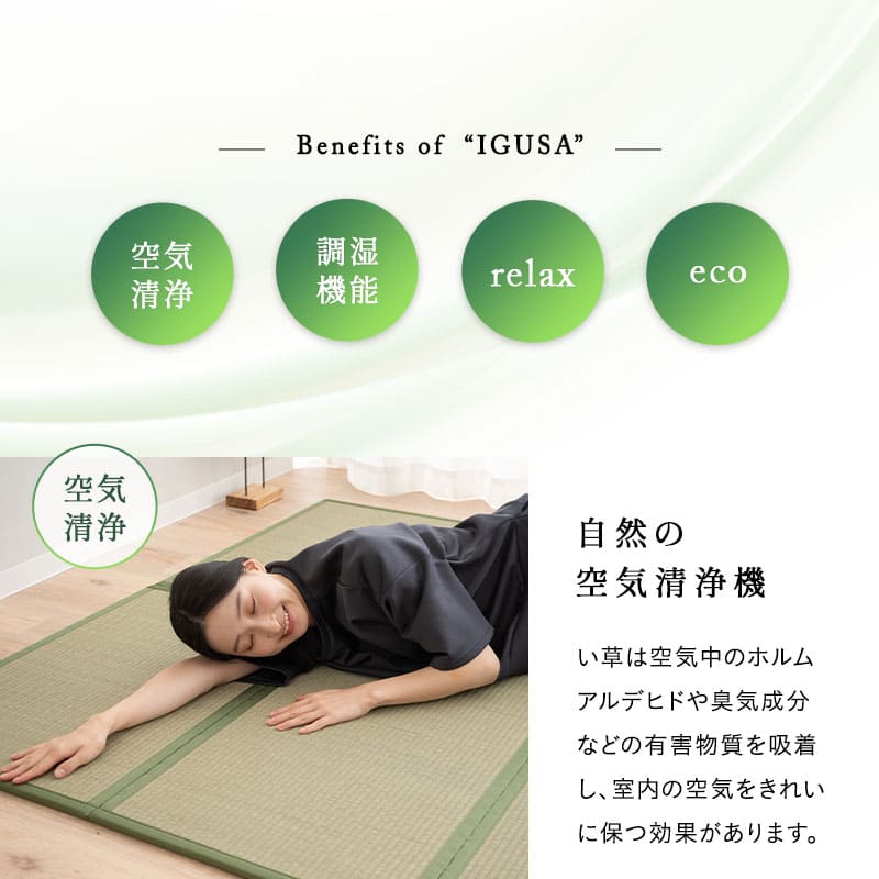 い草ならではの調湿・空気清浄機能があり、室内の湿度や空気環境を整え、やさしい香りによるリラックス効果も魅力です。