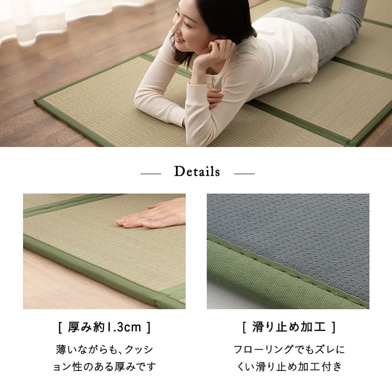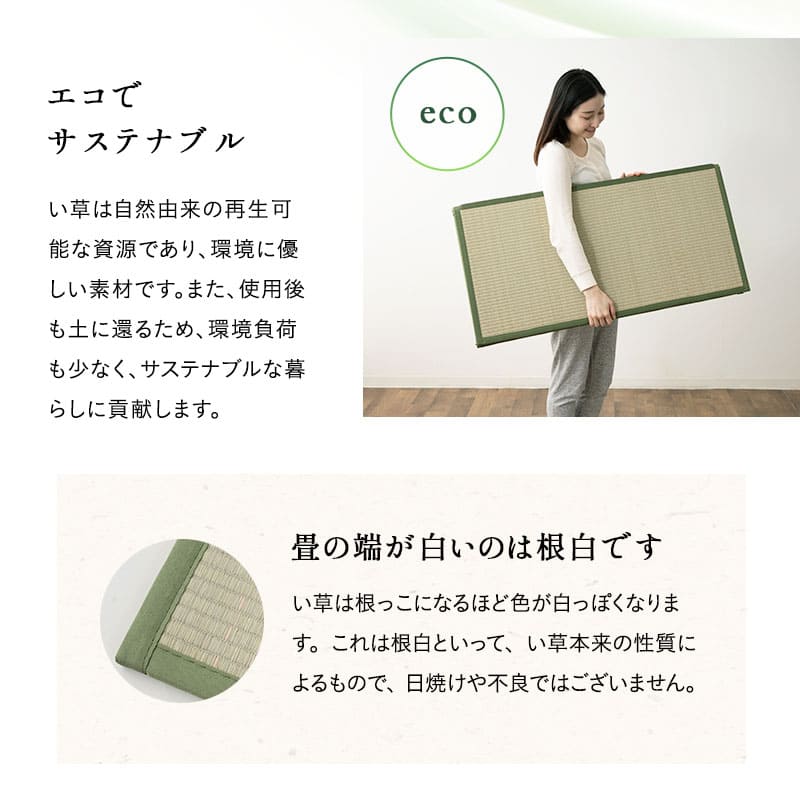 素材 | 本体:天然い草100%(双目織) 裏面:ポリプロピレン(滑り止め樹脂加工) ※畳の端が白いのは、い草本来の性質によるもので、日焼けや不良ではございません。 |
