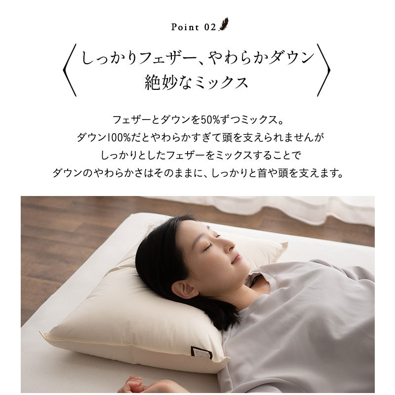 ダウンとフェザーを50%ずつ絶妙にミックスし、やわらかさとしっかり感の両方で頭と首をしっかりサポートします。