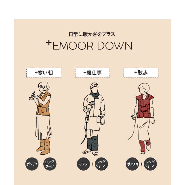 EMOOR DOWNは驚くほど軽く、重ね着でも肩こりしにくい快適な着心地が特長です。