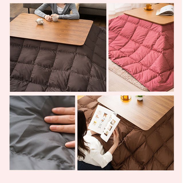 従来のこたつ布団に比べて軽く、保温性が高く快適なぬくもりを実現します。