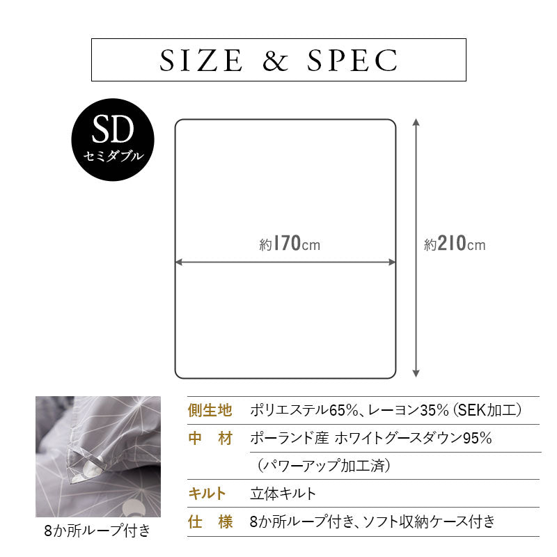 組成 | 生地:ポリエステル65% レーヨン35% (SEK加工) 中身:ポーランド産ホワイトグースダウン95%(パワーアップ加工済) キルト:立体キルト |