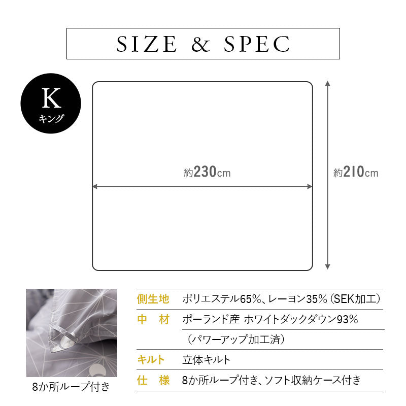 組成 | 生地:ポリエステル65% レーヨン35% (SEK加工) 中身:ポーランド産ホワイトダックダウン93%(パワーアップ加工済) キルト:立体キルト |