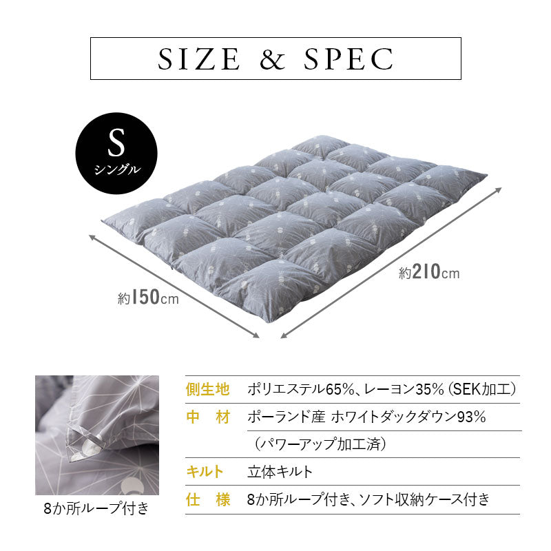 組成 | 生地:ポリエステル65% レーヨン35% (SEK加工) 中身:ポーランド産ホワイトダックダウン93%(パワーアップ加工済) キルト:立体キルト |