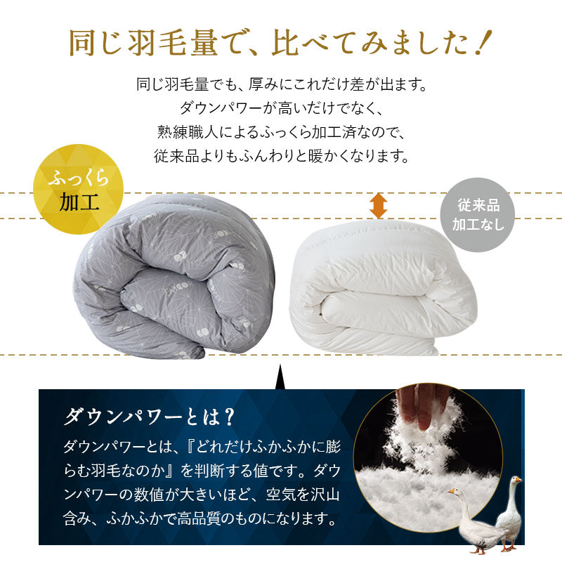 熟練職人によるパワーアップ加工で、かさ高性165mm以上のふっくら感を実現。暖かさが持続します。