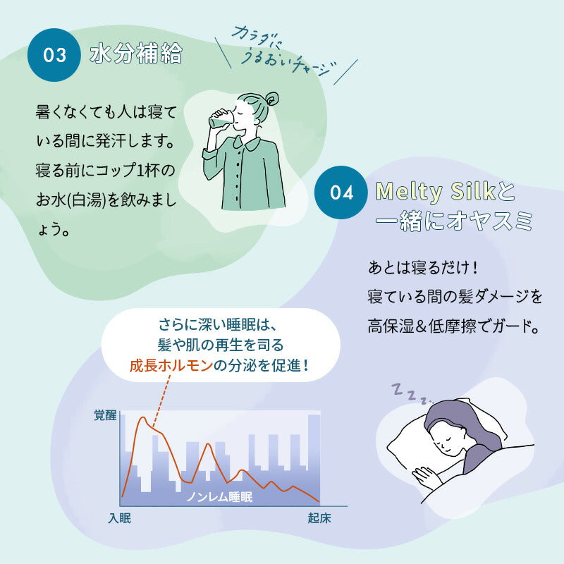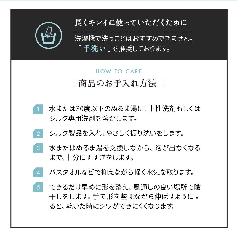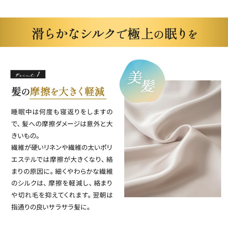 シルクは吸湿性・保湿性・放湿性に優れ、敏感肌の方にも低刺激でしっとり健やかな髪と肌を叶えます。