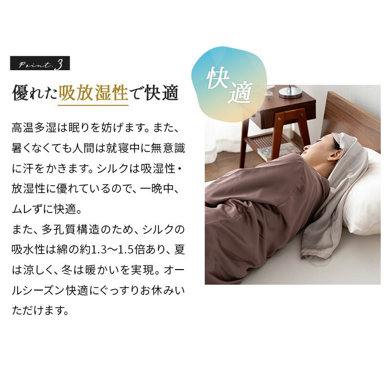 多孔質構造のシルクにより季節を問わず快適で、蒸れや暑さを抑えオールシーズンぐっすり眠れます。