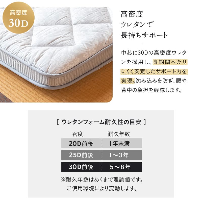 高密度ウレタン中芯を使用し、長期間へたりにくく安定したサポート力で腰や背中をしっかり支えます。