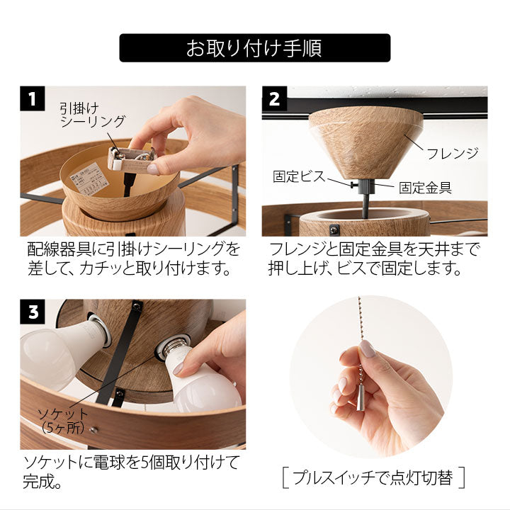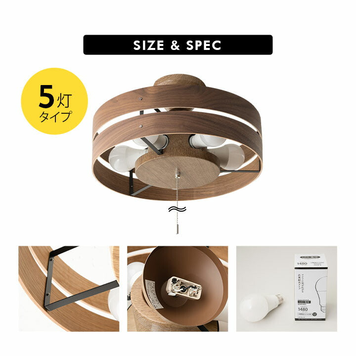 長寿命LED電球が5つ付属し、広い配光で約14畳のお部屋を明るく照らします。
