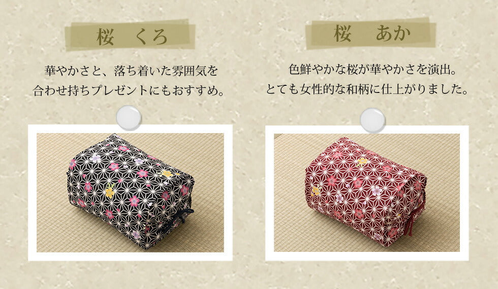 カラー | (縞木綿)こん・えんじ/(麻の葉)あお・あか/(市松)くろ・あお/(桜)くろ・あか |