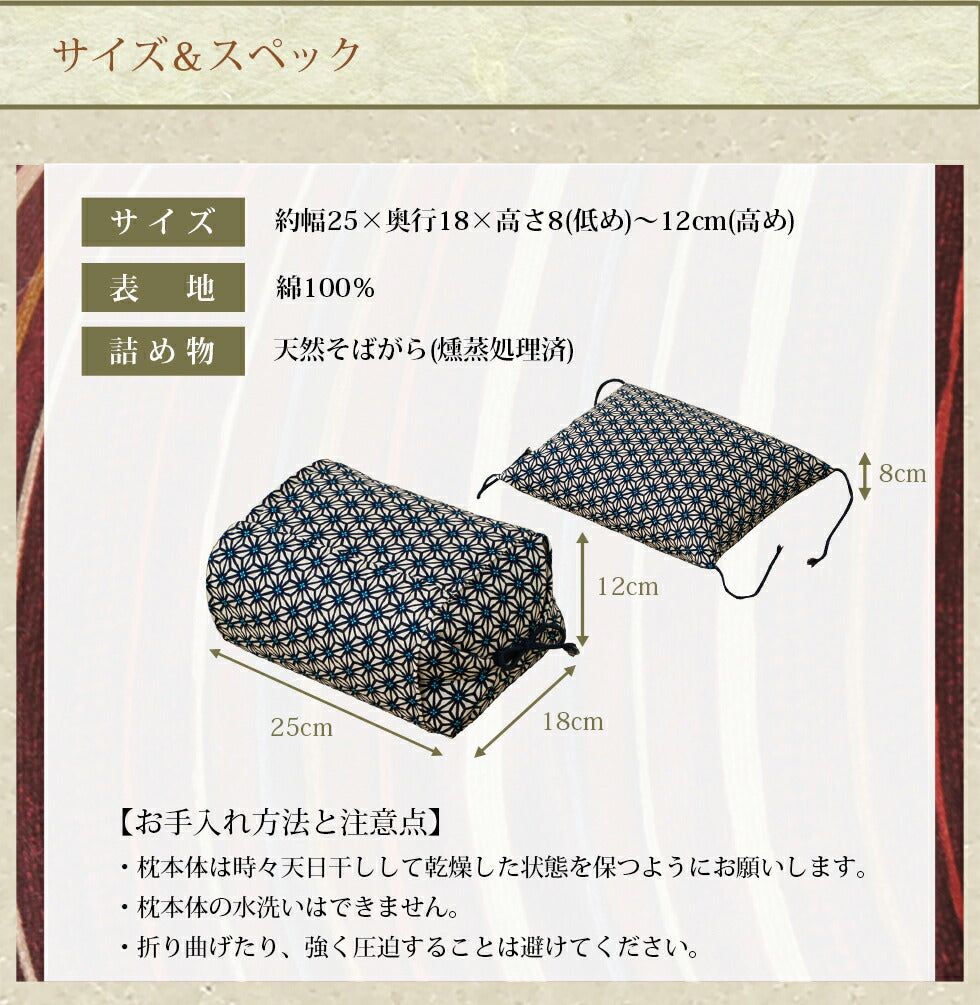 ジャンル | まくら/枕/日本製/国産/そばがら/そば殻/蕎麦殻/高さ調節/高さ調整/綿100%/そばがら枕/そば殻枕/和風/和柄/日本製/ごろ寝/ごろ寝枕 |