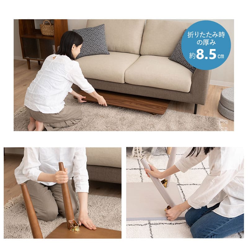 厚み約8.5cmまで折り畳めるため、省スペースで収納可能。組立不要の完成品で手間がかかりません。