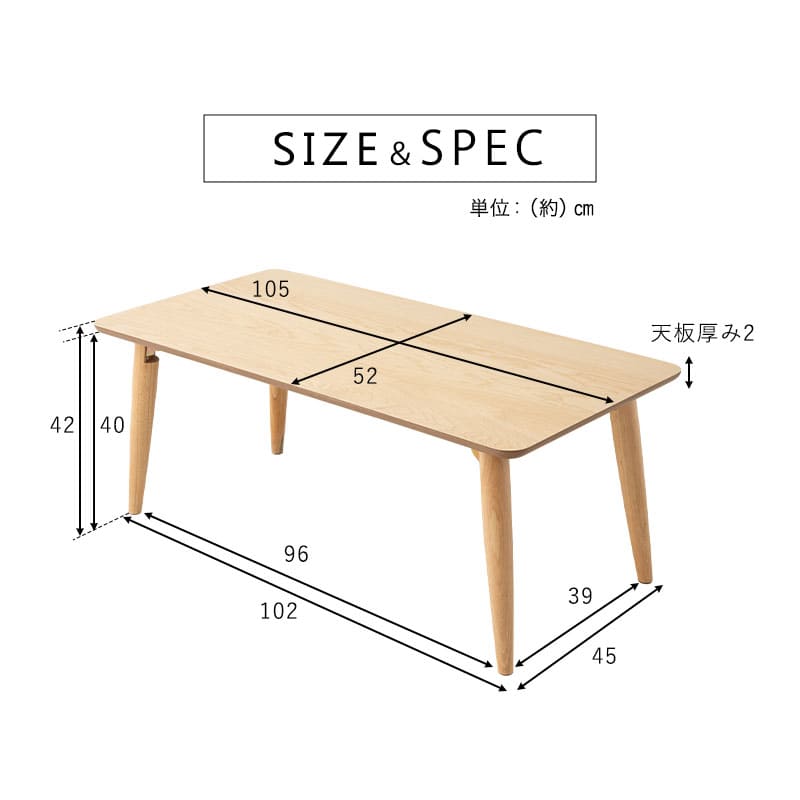 高さ約42cm、幅約105cmの使いやすいサイズ。ソファや床、リビングにも対応し多用途に活躍します。