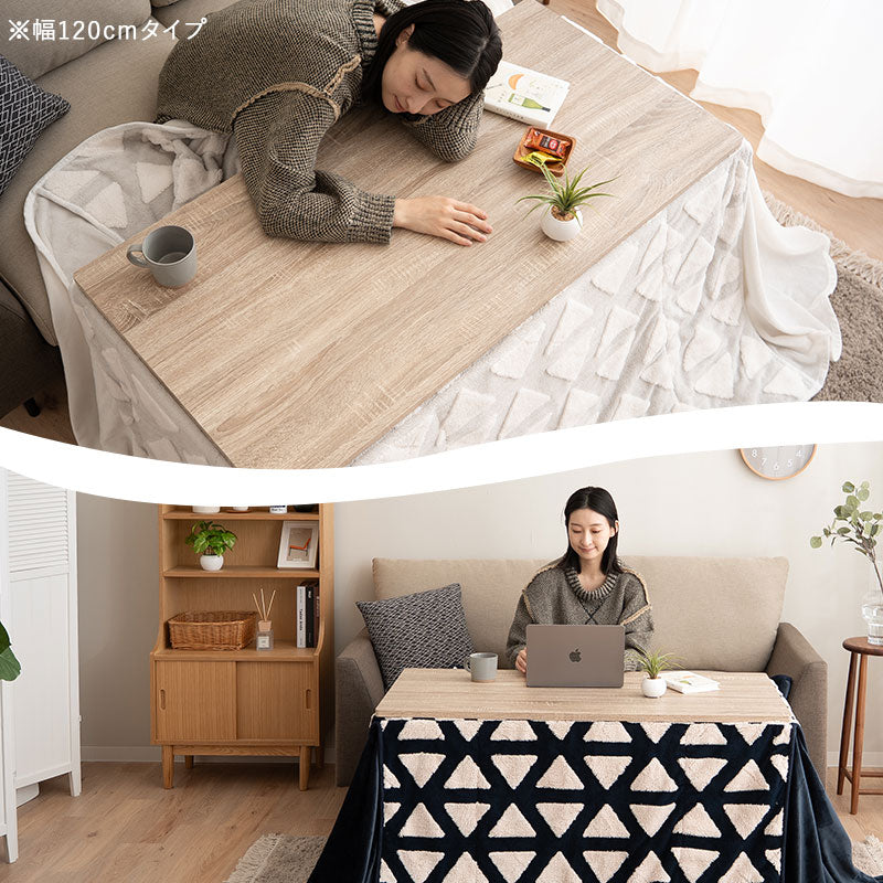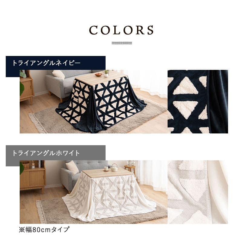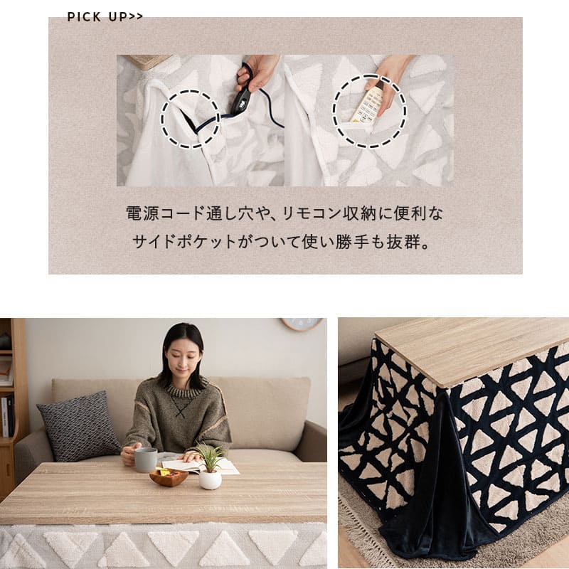 | サイズ | <幅80cm> 全体:約幅230×奥行200cm 天板部分:約幅80×奥行50cm フラップ部分:長さ(一辺)約75cm ※幅80cm×奥行50cmのハイタイプこたつテーブル専用のこたつ布団です。 <幅120cm> 全体:約幅270×奥行210cm 天板部分:約幅120×奥行60cm フラップ部分:長さ(一辺)約75cm ※幅120cm×奥行60cmのハイタイプこたつテーブル専用のこたつ布団です。 |