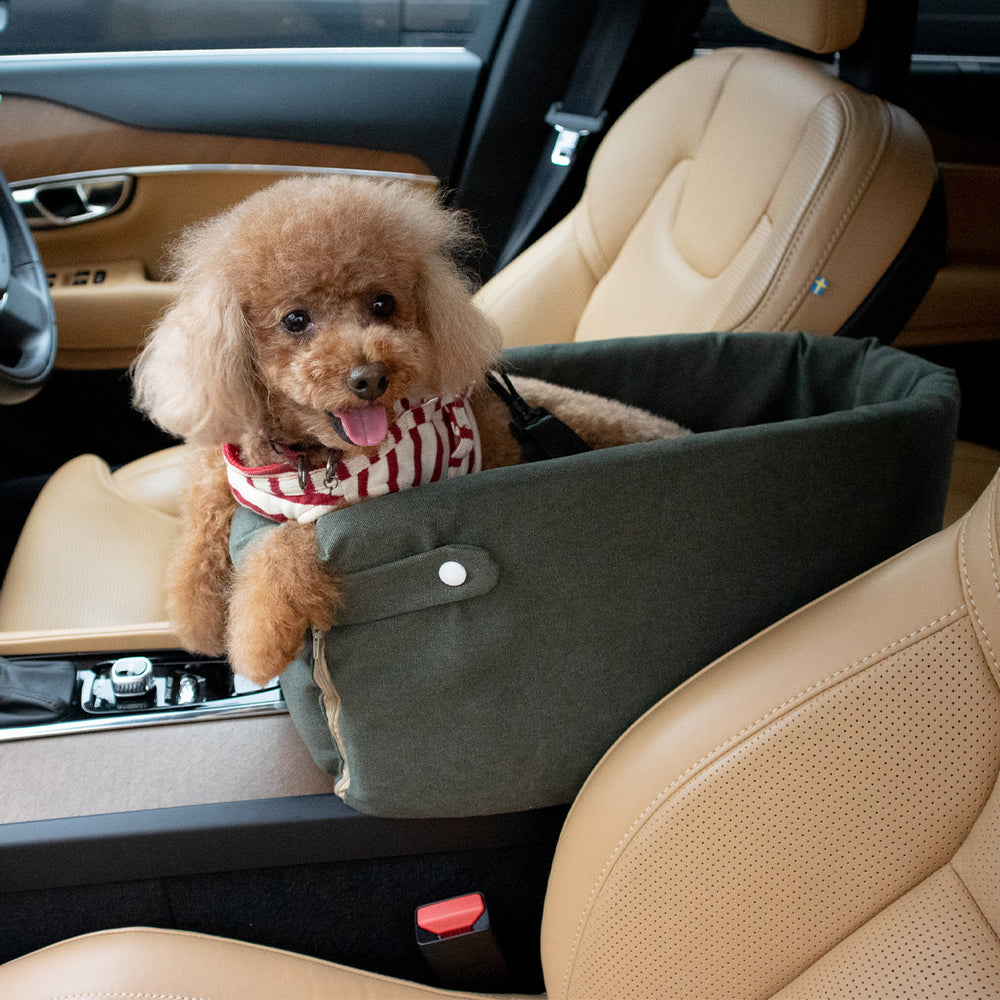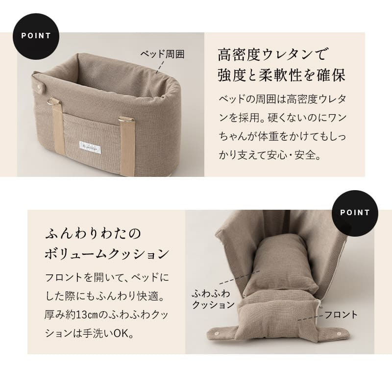 運転席と助手席のあいだに設置でき、小型犬が安心して過ごせるドライブベッドです。