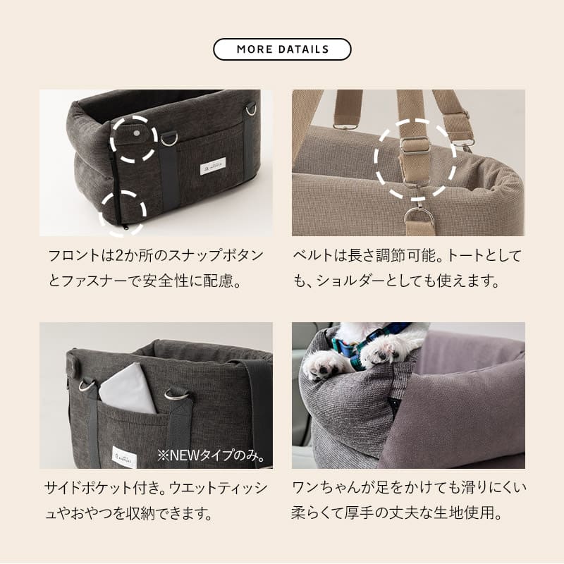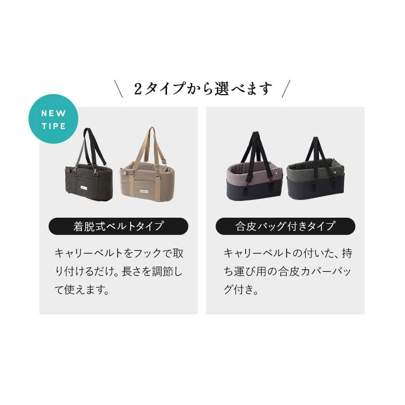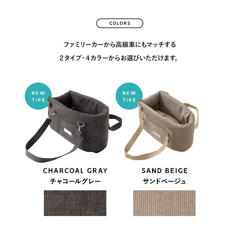 着脱式ベルトタイプ | ■サイズ 約幅24×奥行44×高さ22cm ■素材 表面:ポリエステル100% 底面:ポリエステル100% 中材:ポリプロピレン、ウレタンフォーム ■カラー チャコールグレー/サンドベージュ ■機能 飛出し防止リード(調節可) キャリーバンド×2本(調節可) クッション付き ポケット付き |