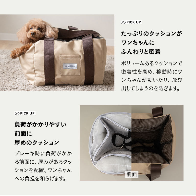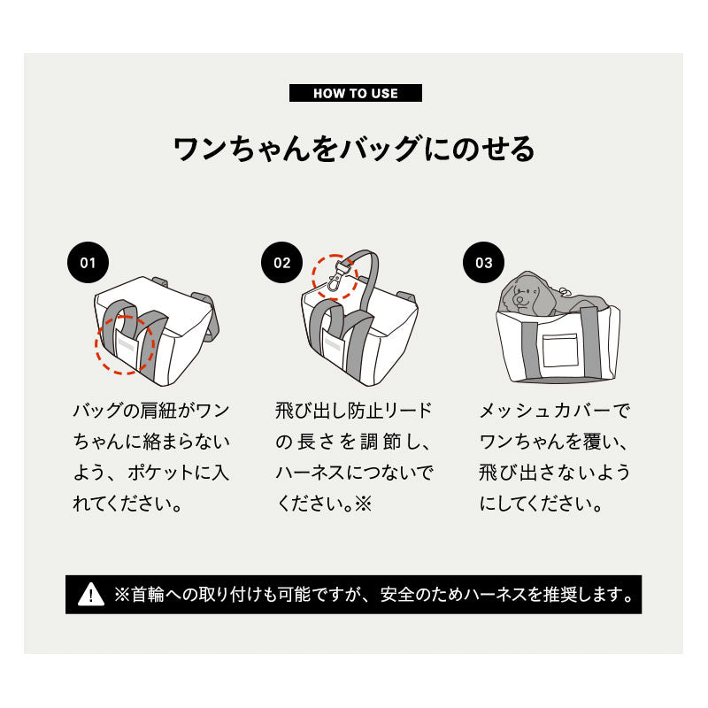飛び出し防止リードとメッシュカバー付きで、ワンちゃんの安全と安心を守ります。