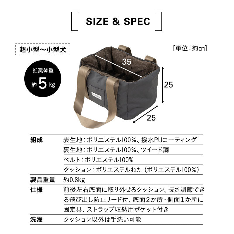 仕様 | 前後左右底面に取り外せるクッション付き 長さ調節できる飛び出し防止リード付き 底面2か所・側面1か所に固定具付き ストラップ収納用ポケット付き |