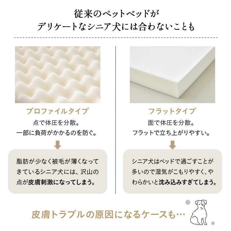 適度な弾力のセルウレタンを採用し、シニア犬の身体を優しく支える寝心地を実現しました。