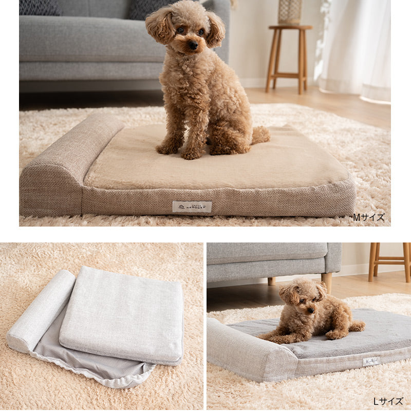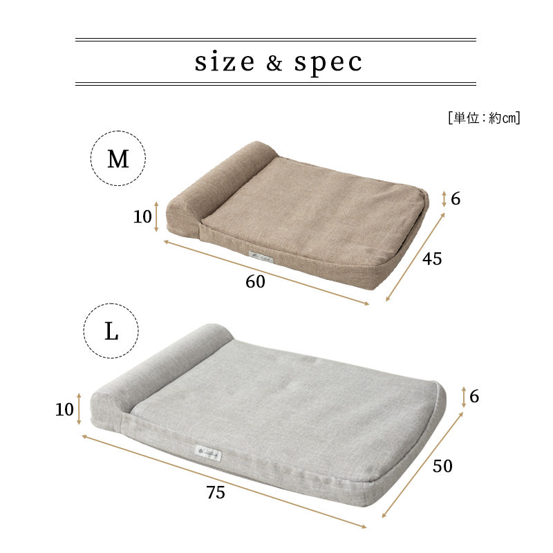 ※愛犬愛猫の体格が大きめの場合や寝姿勢によって、1サイズアップをご検討ください。また、マット部分に愛犬愛猫が収まるようにされたい場合も、1サイズアップをご検討ください。