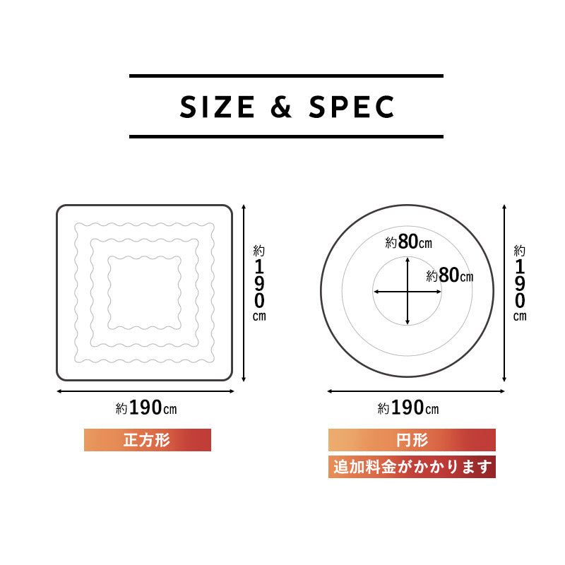 サイズ | 正方形:約幅190×奥行190cm 円形:約直径190cm 長方形:約幅230×奥行190cm 長方形大判:約幅280×奥行200cm |