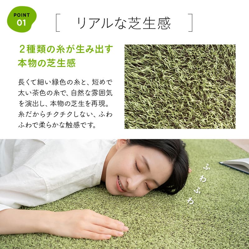 二種類の糸を使い本物そっくりの芝生感と、ふわふわ柔らかな肌ざわりを実現しました。