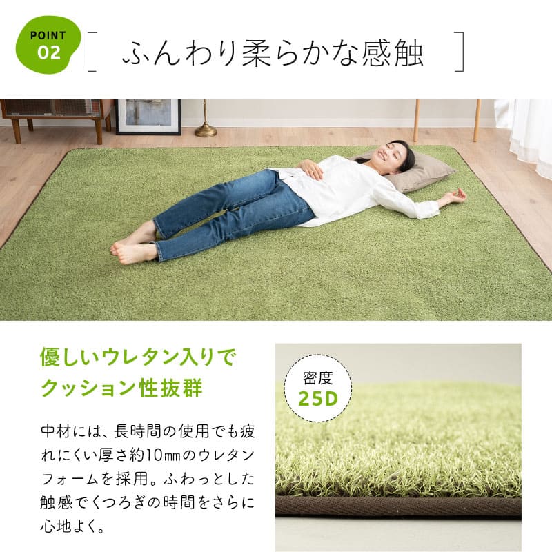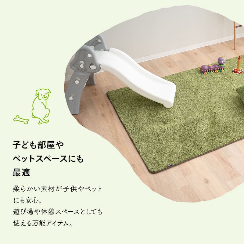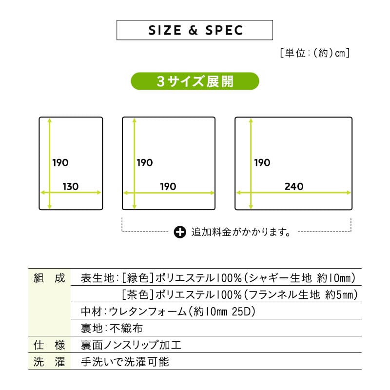 素材 | ■表生地 緑色:ポリエステル100%(シャギー生地) 茶色:ポリエステル100%(フランネル生地) ■中材 ウレタンフォーム 25D ■裏地 不織布(ノンスリップ加工) |