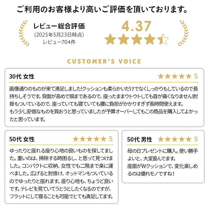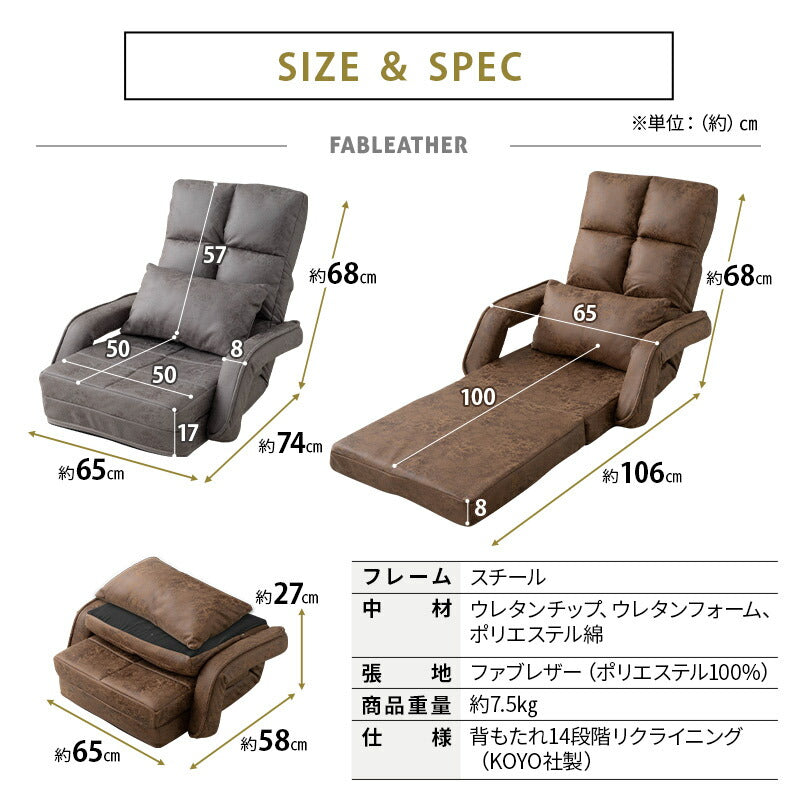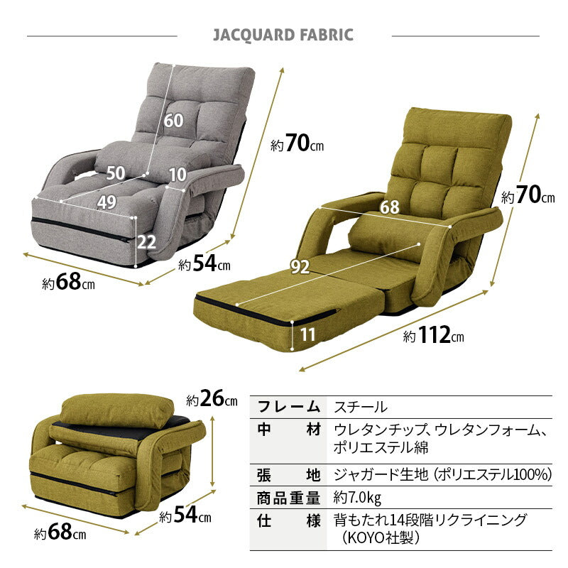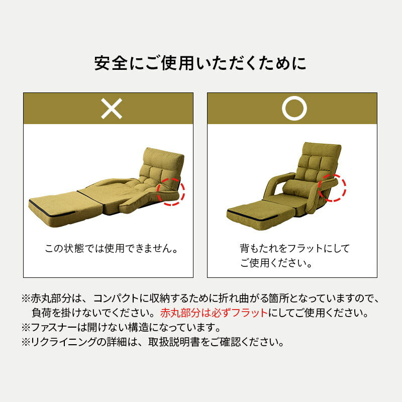 サイズ | <ファブレザータイプ> 全体:約幅65×奥行74-106×高さ68cm 座面:約幅50×奥行50-100cm 座面高:約8/17cm 肘幅:約8cm 背もたれ:約幅50×長さ57cm 重量:約7.5kg <ジャガード生地タイプ> 全体:約幅65×奥行74-106×高さ68cm 座面:約幅50×奥行50-100cm 座面高:約8/17cm 肘幅:約8cm 背もたれ:約幅50×長さ57cm 重量:約7.0kg ※計測する位置や角度により、若干の誤差が生じる場合があります。 |