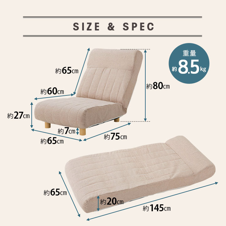 サイズ | ソファ時:約幅65×奥行75×高さ80cm ベッド時:約幅65×奥行145×厚さ20cm (※フルフラットの場合は、必ず継ぎ脚を外してお使いください。) 座面:約幅65×奥行60×高さ27cm 脚:約高さ7cm |