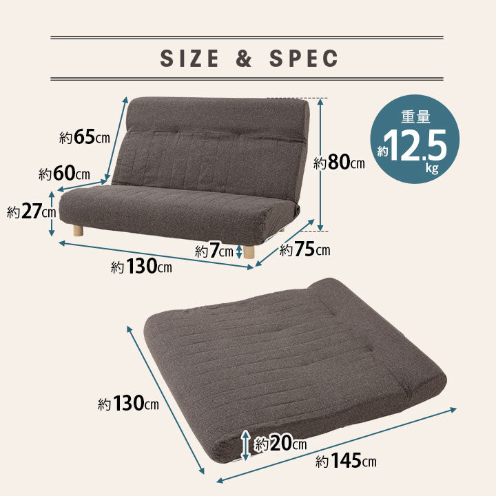 サイズ | ソファ時:約幅130×奥行75×高さ80cm ベッド時:約幅130×奥行145×厚さ20cm (※フルフラットの場合は、必ず継ぎ脚を外してお使いください。) 座面:約幅130×奥行60×高さ27cm 脚:約高さ7cm |
