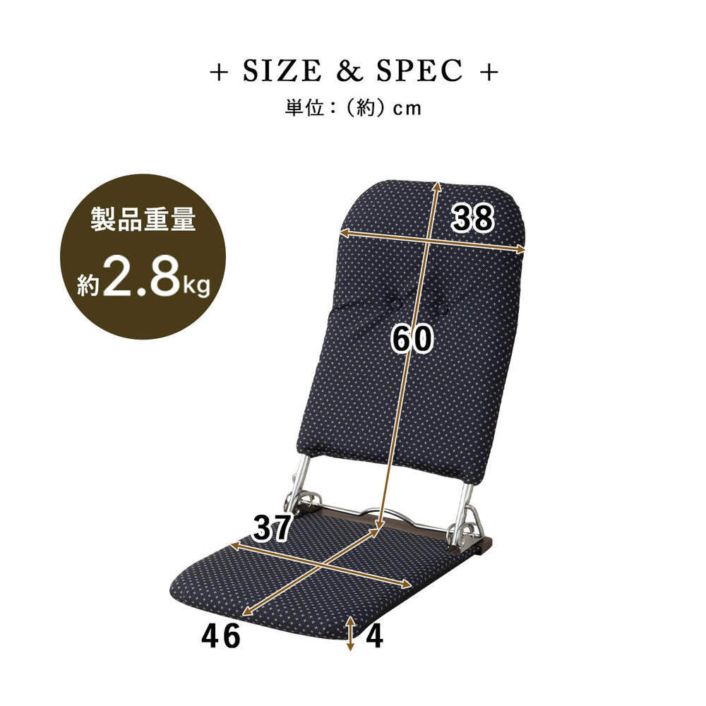 サイズ | チェア時:約幅38×奥行52-79×高さ57-67cm (折りたたみ時:約幅38×奥行75×厚さ10cm) 座面:約幅37×奥行46×厚さ4cm ※奥行・高さは、リクライニングの角度により異なります。 |