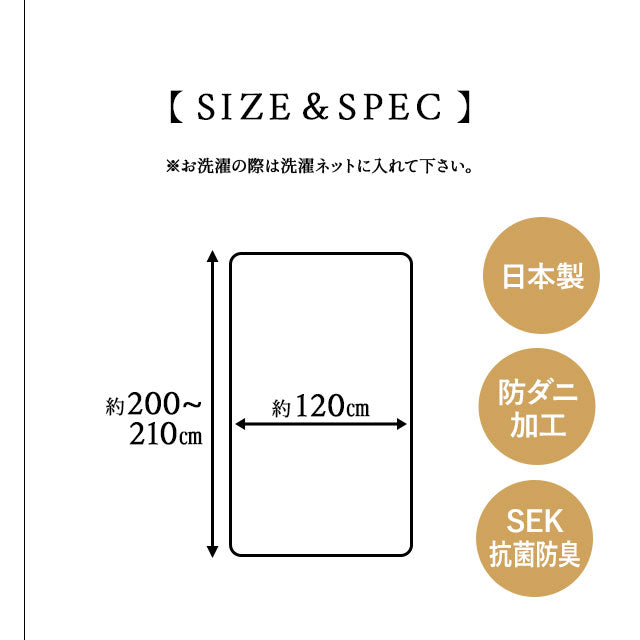 サイズ | セミダブルサイズ / セミダブルロングサイズ 約幅120×奥行き200~210×厚み最大20cm対応 ※こちらのサイズは生地幅より大きい幅になるため、生地のつなぎが入ります。ご理解・ご了承ください。 |