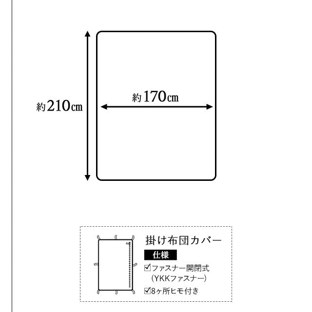 仕様 | 掛け布団カバー:ファスナー開閉式(YKKファスナー)、8ヶ所ヒモ付き ボックスシーツ:ゴムフィット式 ピロケース:ファスナー開閉式(YKKファスナー) |