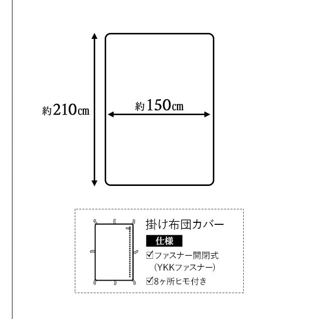 仕様 | 掛け布団カバー:ファスナー開閉式(YKKファスナー)、8ヶ所ヒモ付き 敷き布団カバー:ファスナー開閉式(YKKファスナー) ピロケース:ファスナー開閉式(YKKファスナー) |