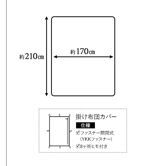 仕様 | 掛け布団カバー:ファスナー開閉式(YKKファスナー)、8ヶ所ヒモ付き 敷き布団カバー:ファスナー開閉式(YKKファスナー) ピロケース:ファスナー開閉式(YKKファスナー) |