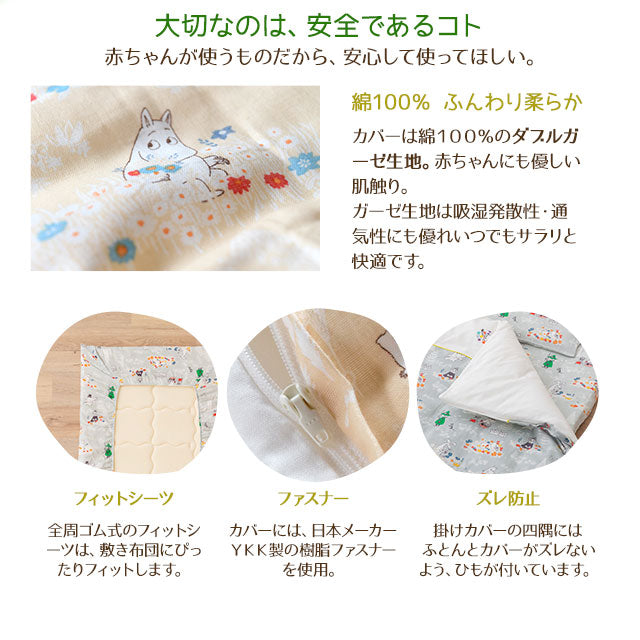 お布団カバーは綿100%のダブルガーゼ生地を使用し、ふんわりやわらかで赤ちゃんの肌にも優しい質感です。